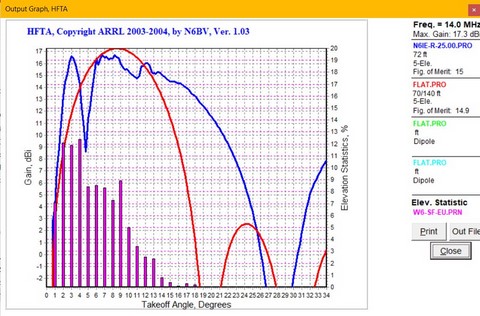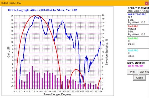 For domestic contests, you can see the same comparison over the US at 75 degrees T on 20 meters with the single DB42 at 72' performing as well as a pair of DB42's stacked at 70' and 140'. The 'lay of the land' is everything!
