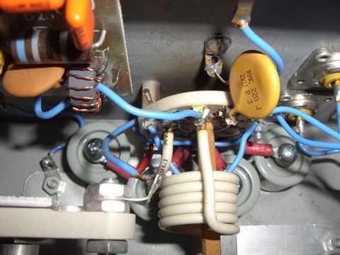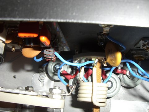 Physically installing the caps proved to be a bit more challenging.  There is serious disassembly required to access a place on the chassis deck where they can be located in very close proximity to the main switch.  It’s important to keep the leads as short as possible to avoid introducing unwanted inductance in series with the caps.  All four caps had their bottoms mounted directly to the chassis with the appropriately-sized hardware, and short leads with spade lugs connect the tops to the switch contacts.  Be sure to sand the chassis to get a clean connection.  The photos below show the finished job.  If you look carefully, you can see where the old caps let out their 'magic smoke' right behind the rotary switch!